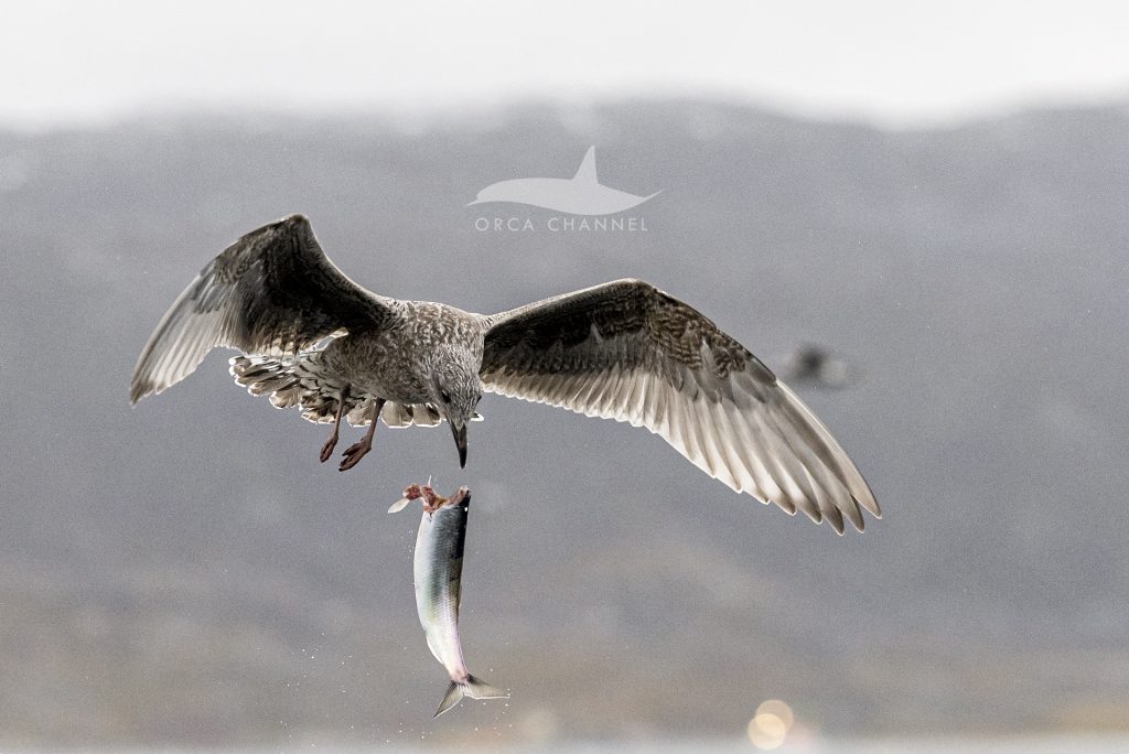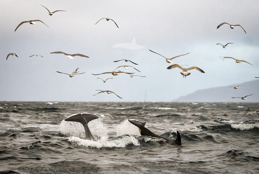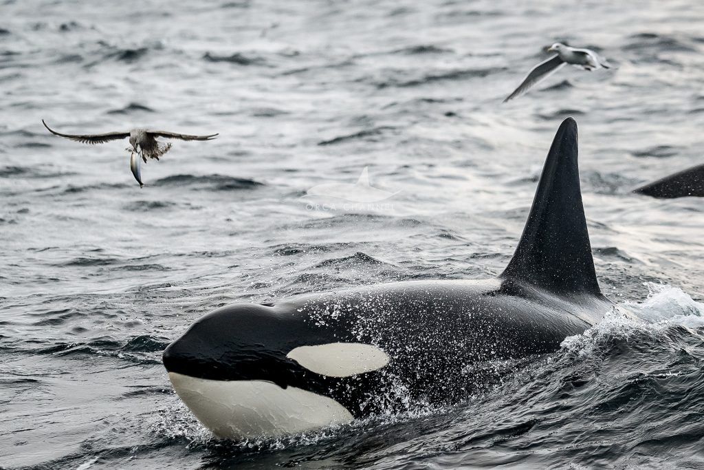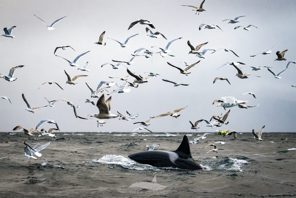In some photos, you can see the stunned herring trying to escape next to our boat, but the poor fish had no chance…Orca under, seagulls above.