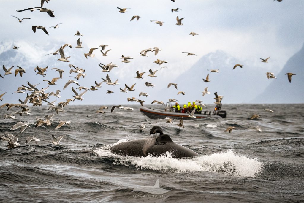 We were there from the very start, and this time the herring had chosen our boat as shelter, so sometimes the orcas were literally right next to the boat. In one of the photos, you can see a female who “smiled” right into the camera before diving under the boat. You can see the shadows of the seagulls on her skin.
