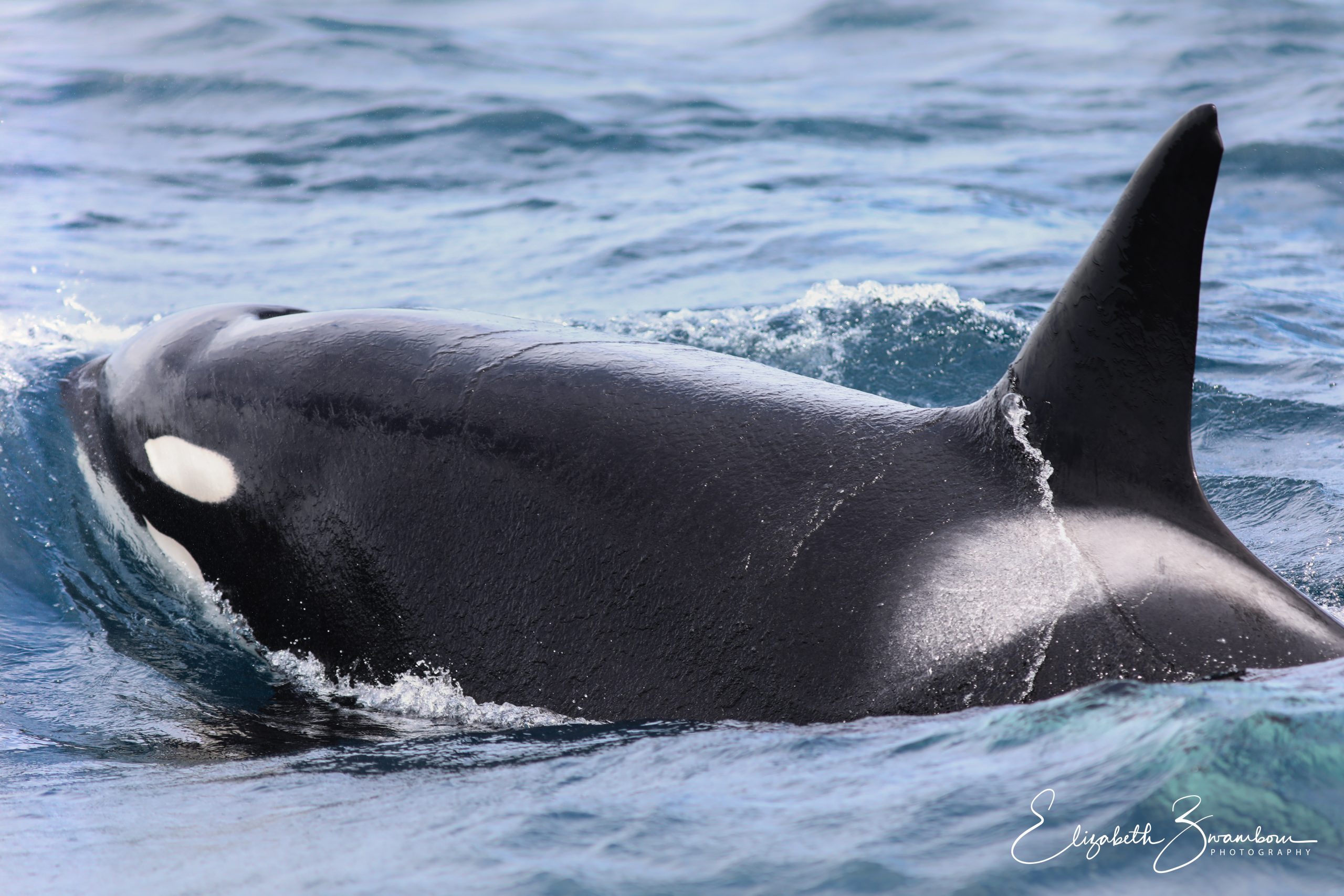I had just finished reciting it when I spotted a dorsal fin out of the corner of my eye. I remember thinking, what kind of dolphin is that now? But within seconds, I saw it, the unmistakable white eye patch of an Orca. And ’Ill admit I made a bit of a ruckus, a pretty loud one. I think everyone on Belenaimmediately knew there were orcas in the area.