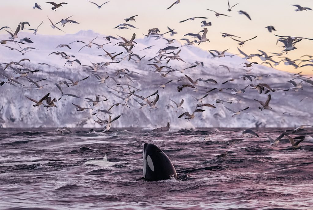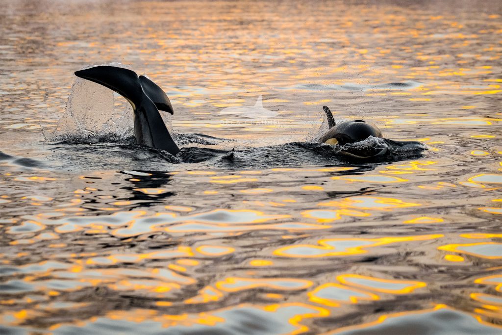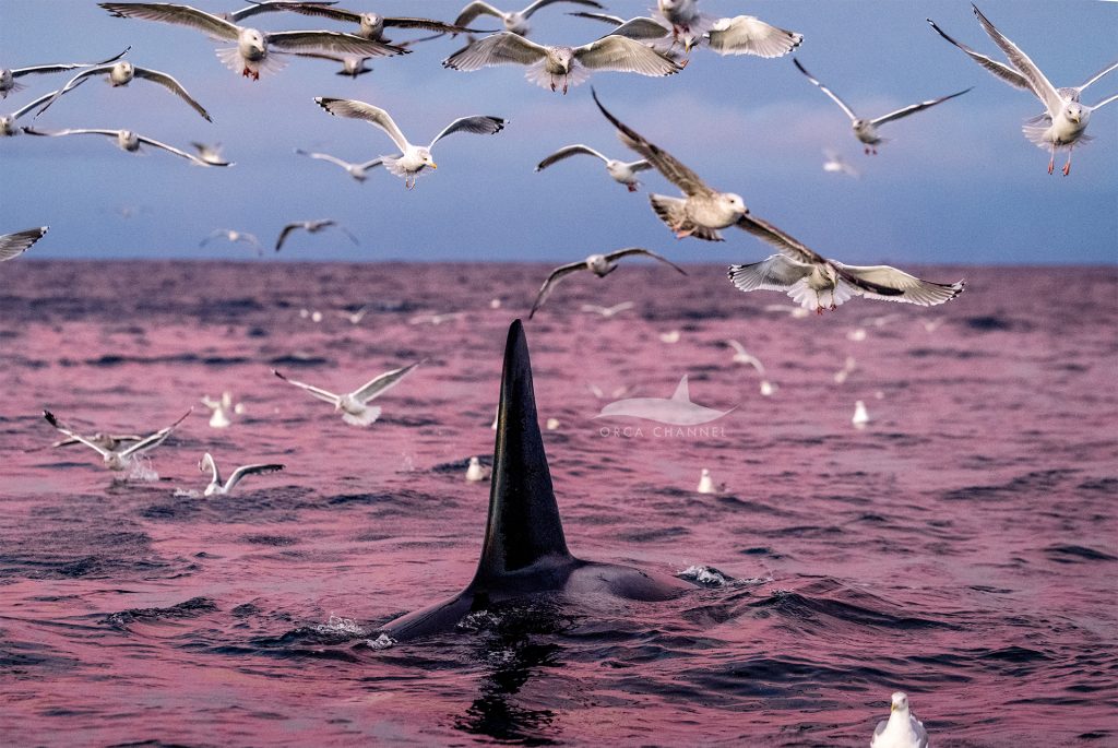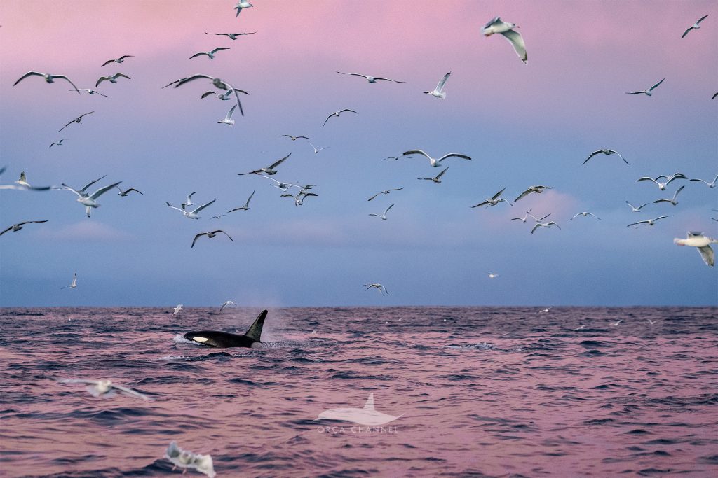 Orcas again were swimming in pink waters The sky was on “fire” and created a mesmerizing reflection, almost unreal.