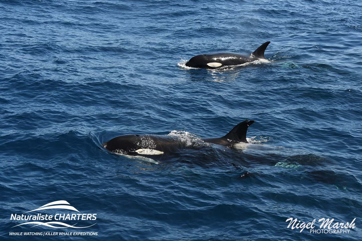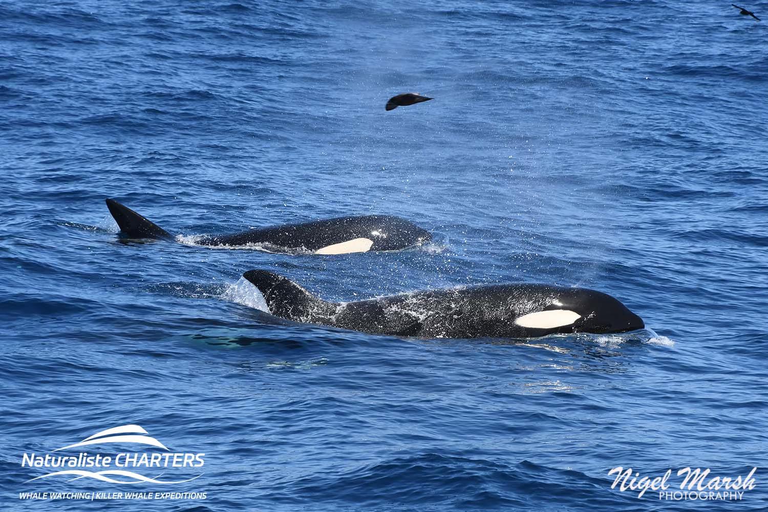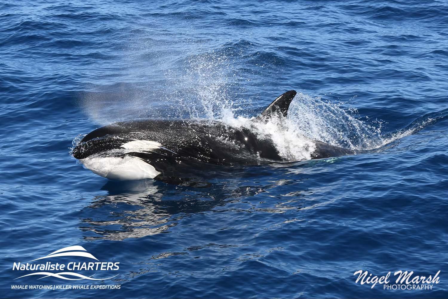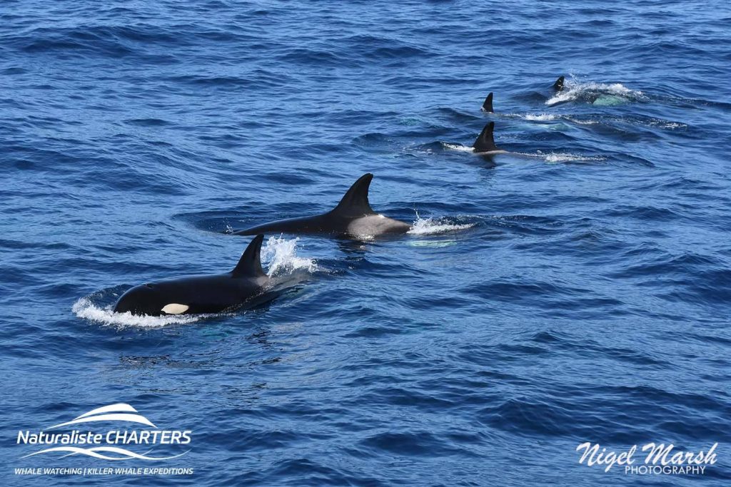 The orcas surged through the water in pursuit of their prey, still 500 metres ahead of us, the white water exuding from their bodies a stark contrast against the calm blue surface of the water.