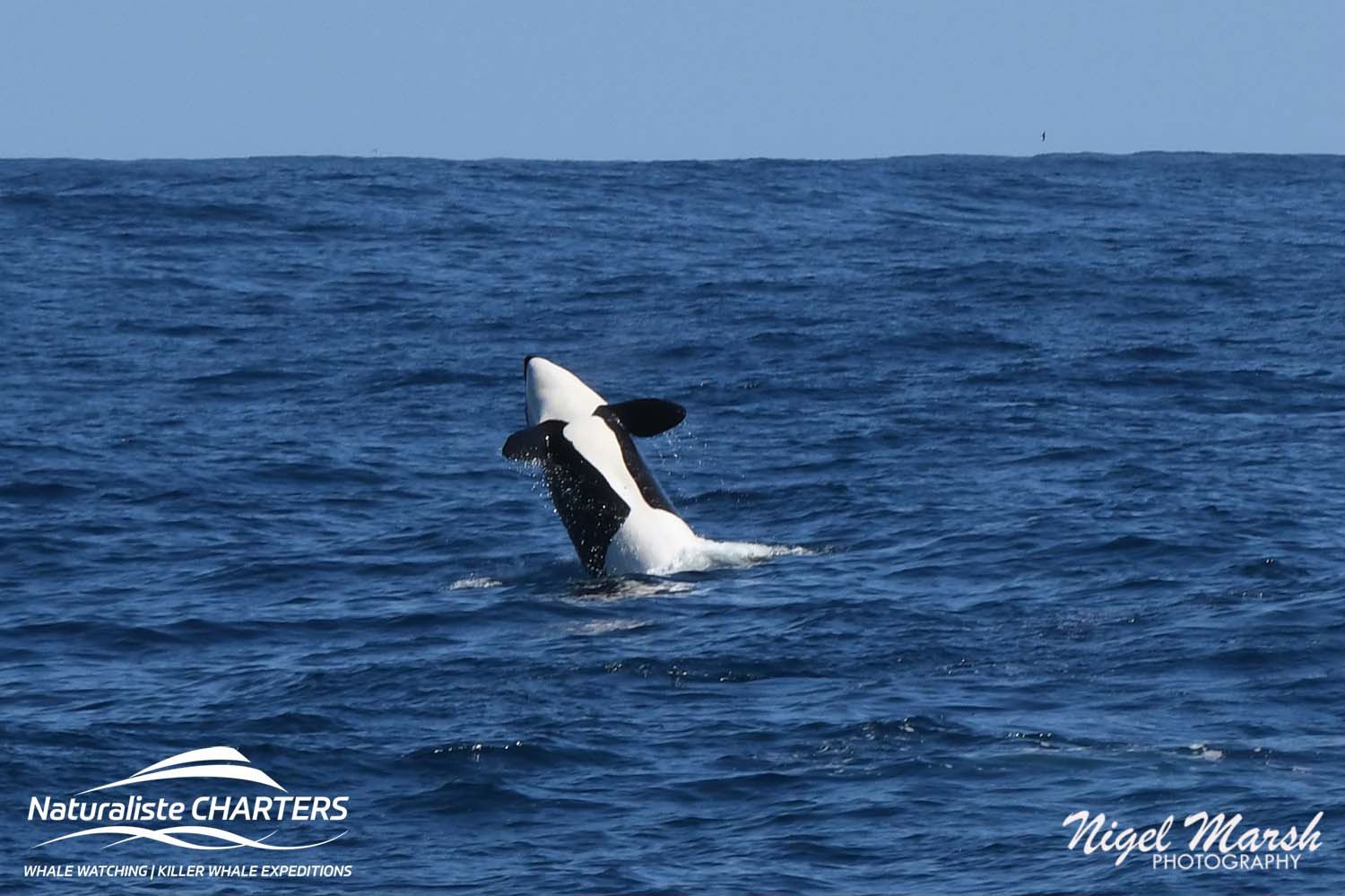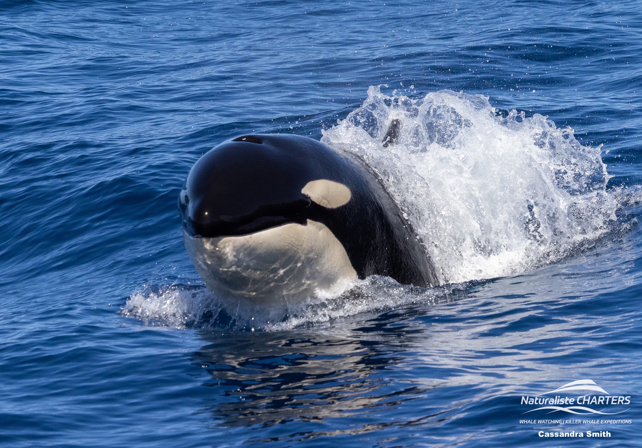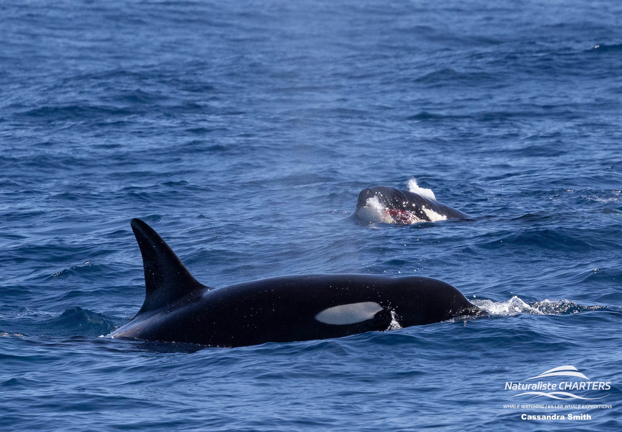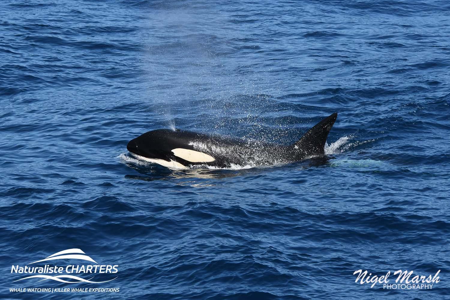 The orcas surged through the water in pursuit of their prey, still 500 metres ahead of us, the white water exuding from their bodies a stark contrast against the calm blue surface of the water.
