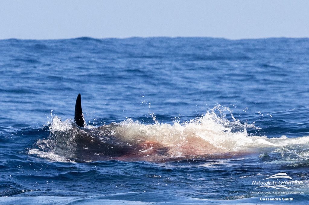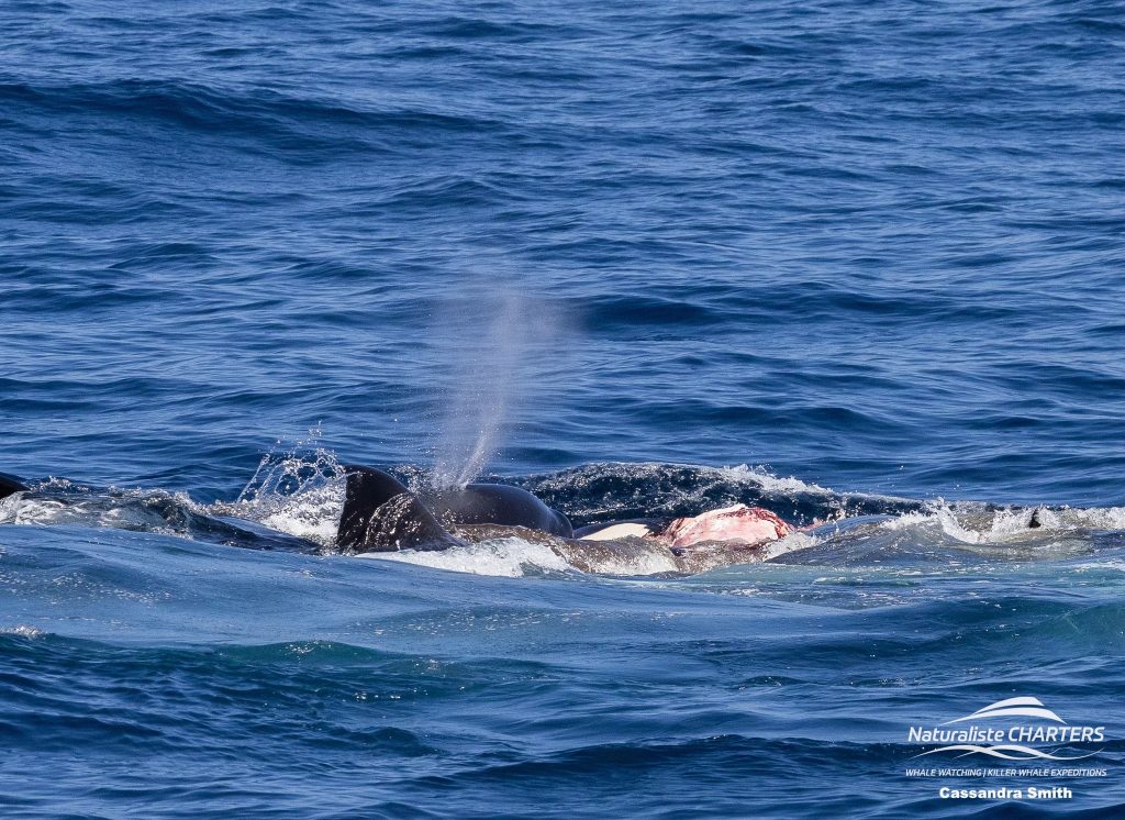 All around us orcas surfaced with fleshy chunks of tissue in their mouths, sharing the kill amongst themselves. Individuals from both Split Tip’s and Alki’s groups were identified in amongst the chaos. The water had turned green with blood and the pungent smell of mammal oil was in the air.