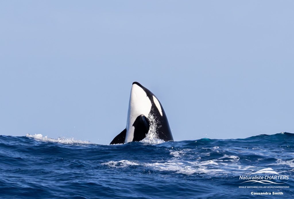 With no signs of the orcas at the hotspot, we extended our search to the neighbouring canyons out to the west. The ocean was calm, with only a gentle rolling swell and a light breeze on the surface – conditions which often mean we have to work a bit harder to track down the orcas who seem to travel out much further from the hotspot on days like this. As we tracked west, we sighted a dorsal fin at the surface, although it didn’t belong an orca. It was the dorsal fin of another ocean predator, a hammerhead shark, but it didn’t stick around for long. Soon after another dorsal fin was spotted breaking the surface, this time attached to a sunfish! We pulled up to get a closer look at the odd-looking animal only to find a second one close by, both likely feeding on bluebottles which had been caught in the tide line.